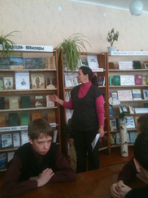 Заведующая библиотекой Полякова О.Я., рассказала ребятам о жизни и творчестве А.П. Чехова. Была проведена викторина: "Знаешь ли ты А.П. Чехова?", ребята читали отрывки из рассказов писателя. Оформлена книжная выставка: "Чехов А.П. Годы жизни и творчества".
