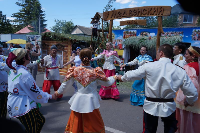 Порадовали многочисленных гостей Медвенского подворья, забойные скоморохи, которые шутками и прибаутками зазывали гостей на праздник, особенно привлекало взор гостей чарующее пение ансамблей «Вольница» и «Медуница», ну и, конечно - же театрализованное представление о Медвенском крае. Было видно, что наше подворье нравится, задумка удалась.