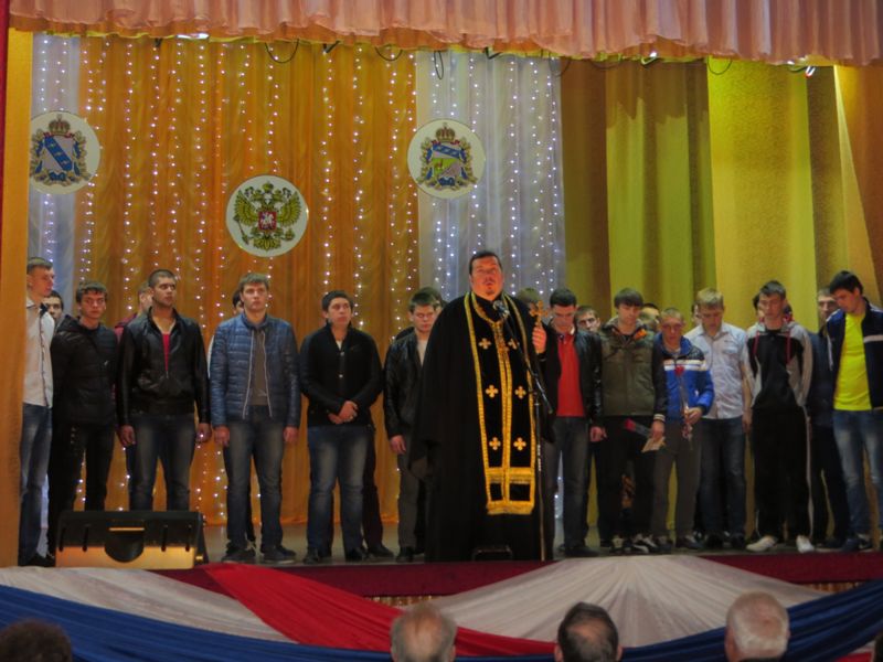 Затем на сцену поднялся начальник отдела военного комиссариата Курской области по Медвенскому району С.А. Бобрышов, который также пожелал призывникам достойно исполнить свой конституционный долг и вручил благодарственные письма родителям, чьи дети проходят службу в данное время.