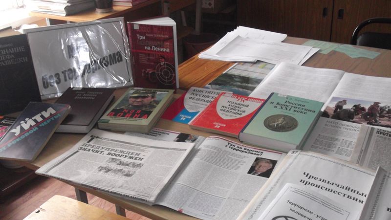 К мероприятию была оформлена книжная выставка «Мир без терроризма» и проведен краткий обзор литературы. Студентам сотрудники библиотеки раздали памятки об угрозе человечеству – терроризме. Наш призыв стоит лишь в том, чтобы каждый по возможности решил для себя, что мы, больше не можем мириться с тем, что рядом с нами происходят ужасные вещи: взрывы, гибель сотен людей от рук террористов. Этот кошмар наших дней, который должен прекратиться. Сколько горя это приносит нам всем.