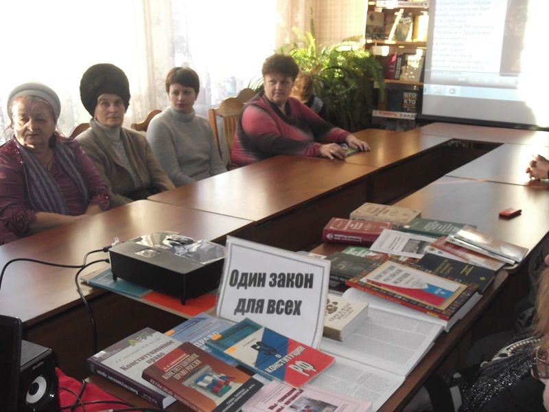 Заместитель прокурора Медвенского района Чаплыгина Наталья Вячеславовна познакомила присутствующих с историей возникновения Конституции, основных этапах её становления как основного закона страны. Обсуждалось современное толкование российских символов, вопросы важнейших конституционных положений, определяющих права и обязанности граждан Р.Ф. В ходе мероприятия присутствующие обратились со своими насущными проблемами по оказанию услуг по содержанию и ремонту общего имущества многоквартирных жилых домов, по оплате коммунальных услуг и земельного налога. Участники мероприятия получили квалифицированную помощь и разъяснение по интересующим вопросам. Мероприятие сопровождалось электронной презентацией: «Конституция - закон, по которому мы живем», раскрывающей краткую историю развития конституционного права в России, с основными правами и обязанностями гражданина, закрепленными в основном законе государства – Конституции России. Была оформлена книжная выставка: «Один закон для всех».