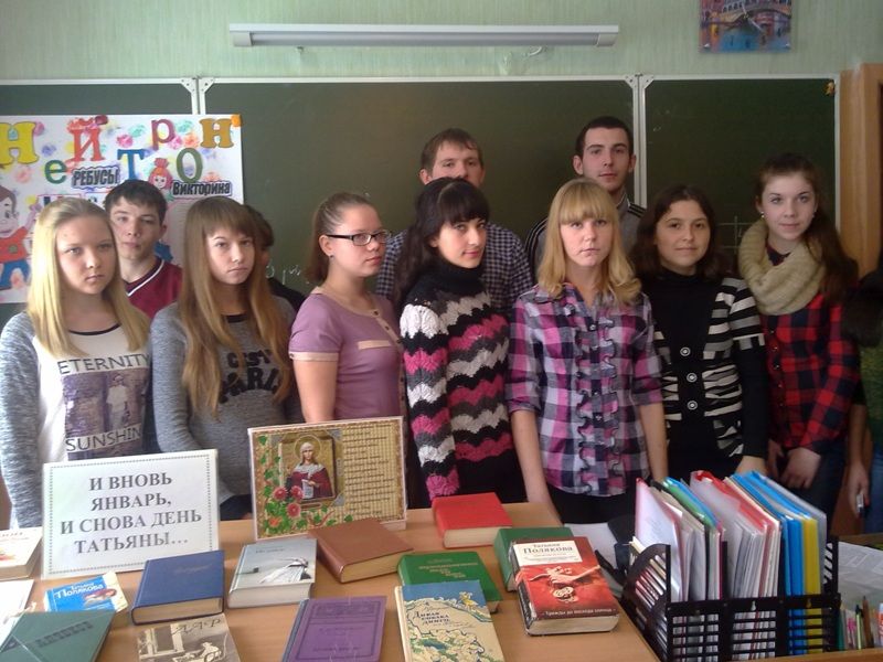 Среди учащихся Обоянского аграрного техникума прошло очередное заседание клуба Ровесник. Библиотекари рассказали об истории возникновения этого праздника, о святой великомученице Татьяне и о том, что она считается покровительницей студентов. Присутствующие узнали о студенческих традициях разных народов, была проведена литературная викторина среди обучающихся. Активное участие приняли: Чертова Алёна, Степанов Сергей и Мезенцева Римма. Мероприятие сопровождалось электронной презентацией:«Святая мученица Татьяна», звучал гимн студентов, был проведен обзор у книжной выставки: «И вновь январь, и снова день Татьяны…». Таким образом, молодёжь приобрела много полезных знаний и положительных эмоций.