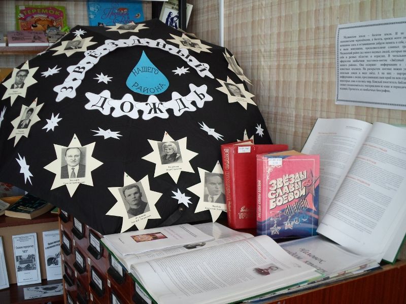В читальном зале Межпоселенческой библиотеки оформлена необычная выставка-зонтик «Звёздный дождь нашего района». Она содержит информацию о наших известных земляках. На раскрытом зонтике можно увидеть капельки дождя в виде звёзд. А на них - портреты и информация о людях, прославивших наш район на всю страну, а некоторые даже и на весь мир. Каждый посетитель библиотеки сможет познакомиться с материалами из книг и периодических изданий и прочитать необычные биографии наших земляков. Выставка дала возможность нам гордиться славной историей нашего района, прекрасными людьми – медвенцами.