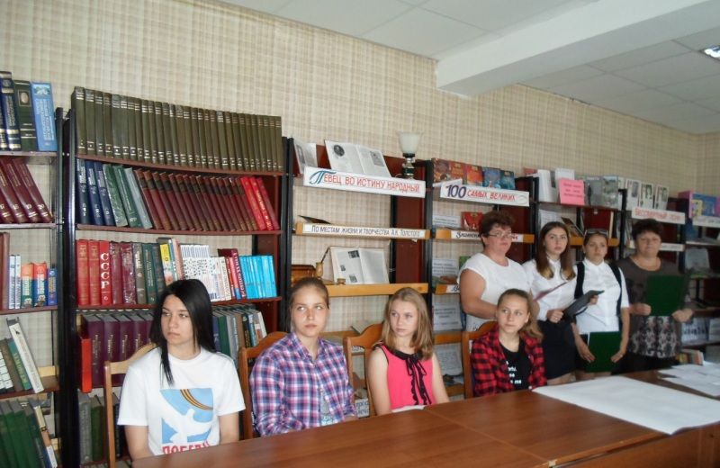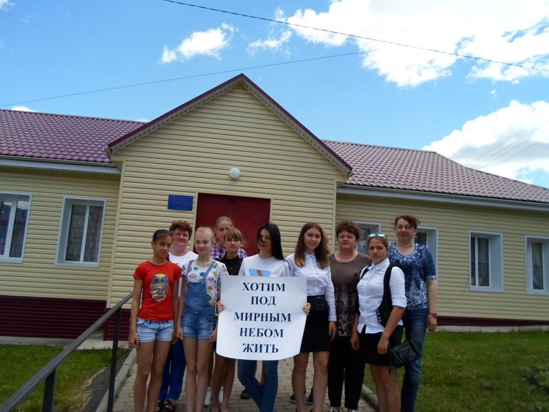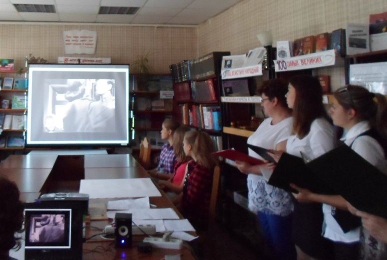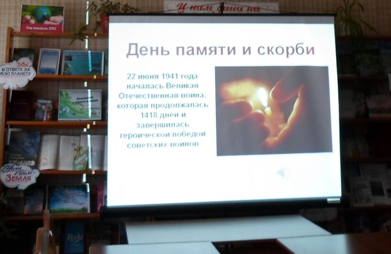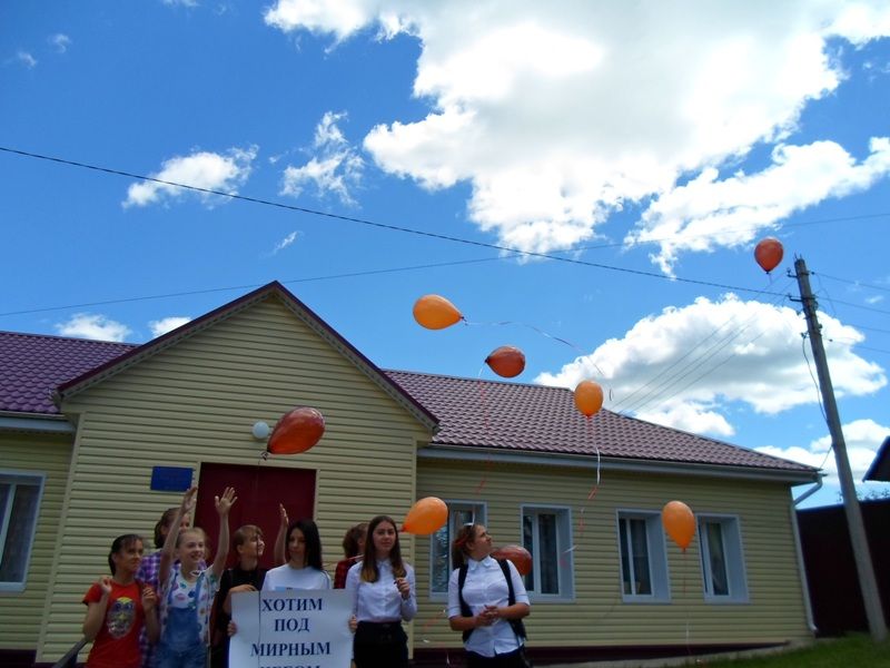 Для собравшихся прозвучали стихи и песни военных лет, сделан обзор книжно – иллюстрированной выставки: «Набат войны нам вновь стучит в сердца», на которой были представлены книги о событиях Великой Отечественной войны. Была представлена презентация: «Нам не помнить об этом нельзя». Провели викторину: «Книги, идущие дорогами войны». Кульминационным моментом мероприятия стало - под девизом: «Хотим под мирным небом жить» были выпущены воздушные шары. Присутствовало 18 чел.