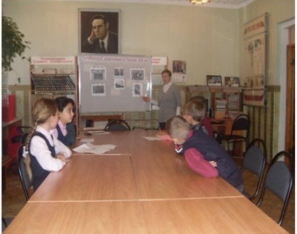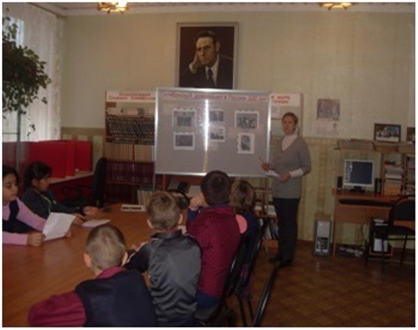 К знаменательной дате в библиотеке была оформлена выставка «Великой Октябрьской революции в России - 100 лет». Заведующая библиотекой открыла мероприятие, рассказала о революционных событиях 1917 года, о вожде пролетариата В. И. Ленине и его соратнике Л. Д.Троцком. Вниманию детей была представлена презентация о жизнедеятельности В. И. Ленина.