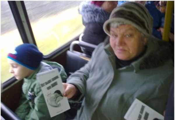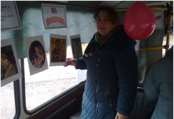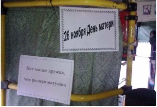 Пассажиры проделали свой маршрут в праздничном автобусе, украшенном шарами и репродукциями известных художников, изображающих образ матери . В салоне была размещена информация о праздновании Дня Матери, высказывания великих людей о Матери, пословицы, поговорки, афоризмы. В подарок пассажиры «Читающего маршрута» получили информационные буклеты.