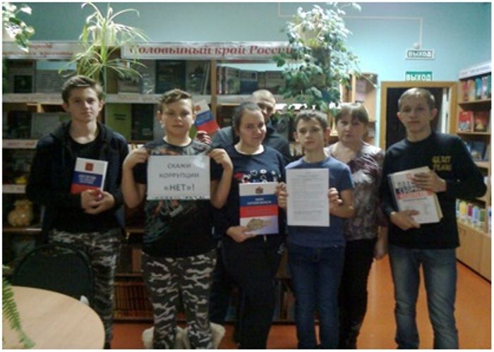 Библиотекарь рассказала школьникам о формах, основных признаках коррупции, также были рассмотрены ситуации и о какой форме коррупции в данном случае идет речь. Мероприятие проходило в форме беседы-диалога. Школьники сделали выводы: прежде всего, нужно начать с самого себя и требовать устранения коррупционных проявлений от окружающих. Необходимо быстро реагировать на все виды проявлений коррупционных правонарушений.