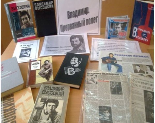 Для читателей подготовлена книжная выставка «Владимир. Прерванный полет», на которой экспонировались разнообразные издания книг о Владимире Высоцком, его стихи, альбомы, сборники стихов с авторскими комментариями, размышлениями о жизни, воспоминания друзей Высоцкого, наборы фотографий поэта разных лет.