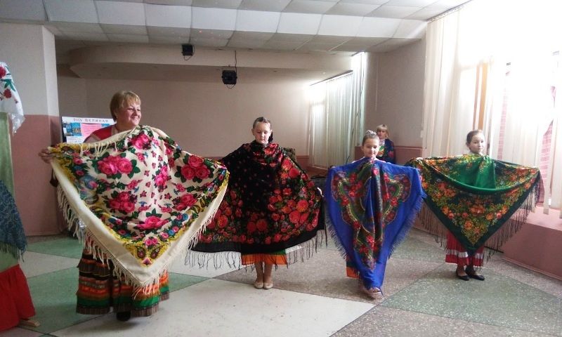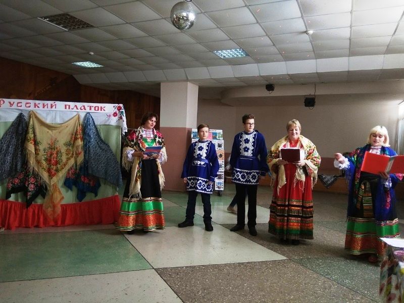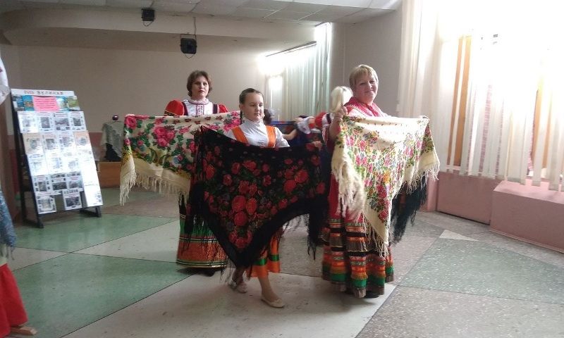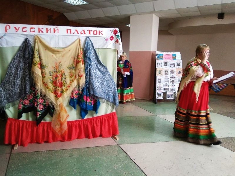 Библиотека превратилась в яркую цветущую поляну: здесь - крупные сочные соцветия, там - мелкий орнаментальный узор платков. Для гостей праздника прозвучали лирические песни «Подари мне платок», «Оренбургский пуховый платок», «Синий платочек», стихи С. Есенина и А. Блока, посвященные платку.