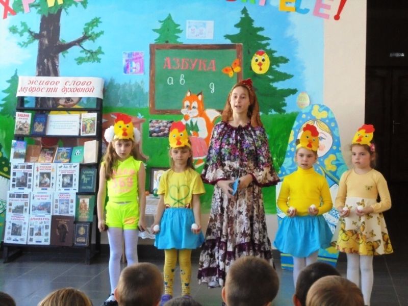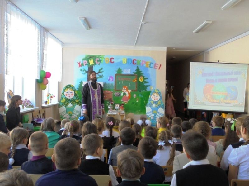 Мероприятие включило в себя сочетание информации о народных пасхальных традициях и церковной обрядности. С помощью видео презентации учитель Харитонова Е.В. рассказала о традиции празднования Пасхи, об истории праздника Вход Господень в Иерусалим традиции покраски яиц и христосования, о праздничной литургии на Пасху.