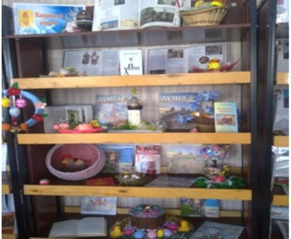 В преддверии главного православного праздника – Пасхи для пользователей библиотеки, библиотекари оформили красочную книжную выставку «Пасхальная радость», на которой представлены книги о празднике, художественные произведения пасхальной тематики, а также журналы с интересными идеями пасхальных блюд. Наряду с книгами об истории и символах празднования Пасхи, о народных традициях и обычаях, представлены пасхальные атрибуты - крашенные яйца, веточки вербы и конечно, поделки наших читателей.