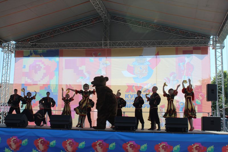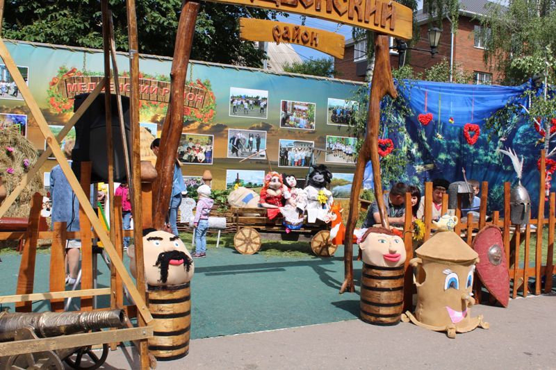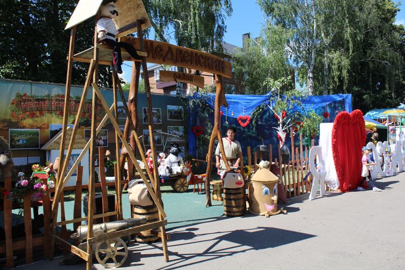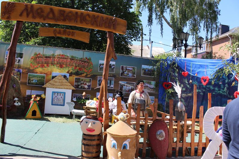 «Гуляй, ярмарка!» - сказал ведущий. И она заиграла, заискрилась, закипела многоцветьем товаров, звоном колоколов, голосами певцов, многоголосьем толпы. Богатая, разноцветная, развеселая и разудалая. Интереснее всего бывать там, где по традиции размещаются подворья районов, которые поражают своей фантазией, оригинальностью, огромной любовью к своей малой родине. Зрелище просто феерическое. Но наше медвенское подворье среди этой пестроты не затерялось. Казачий хутор со сторожевой вышкой и караульным на ней, пушкой у ворот, разнообразием убранства старинной казачьей избы, былинного, сказочного ландшафта с маленьким прудом и живыми сомами — вот таким увидели наше подворье гости ярмарки. А встречали гостей в горнице нарядно одетые казаки и казачки. На хуторе можно было угоститься старинными забытыми блюдами земли медвенской, приготовленные Медвенскими умельцами учреждений культуры чаем, заварка была из душистых трав, старинного большого самовара, который отчаянно пыхтел, стараясь напоить всех желающих.