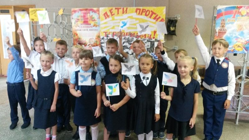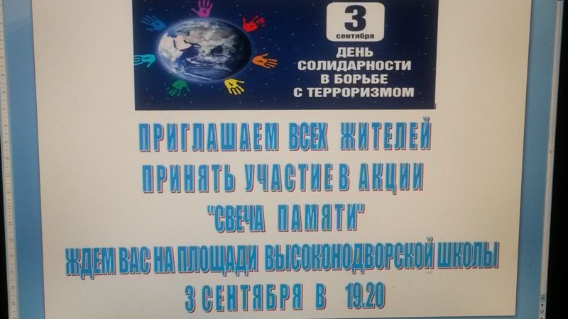 В этом году 3 сентября была проведена эстафета «Мира и добра». Учащиеся младших классов нашей школы вместе с работниками СДК делали флажки с голубем-символом мира, рисовали детские ладошки - символ дружбы. Старшеклассники оформили Памятки «Террору - НЕТ!». В каждом классе были проведены беседы «Терроризм - угроза обществу». Весь коллектив принял участие в учебной эвакуации. В память о погибших в Беслане, дети запустили в небо шары. Ближе к вечеру на школьном дворе вновь собрались дети и взрослые. Ведущие подвели итоги акции, читали стихи. Была объявлена Минута молчания и зажжена символическая Свеча Памяти.