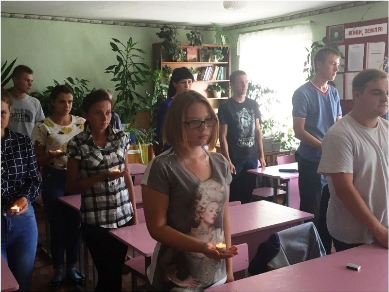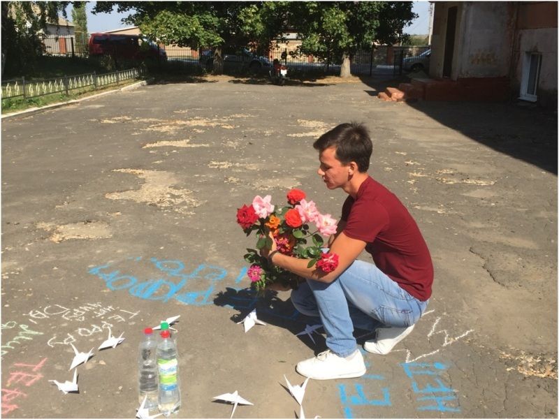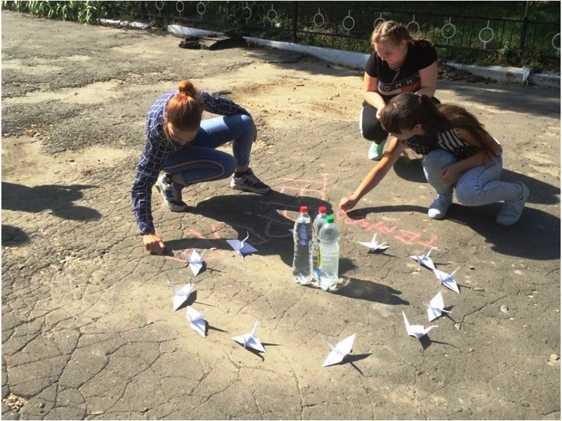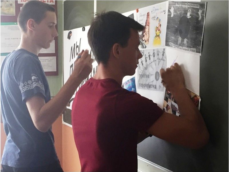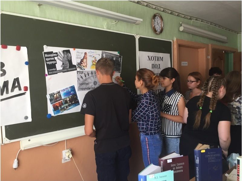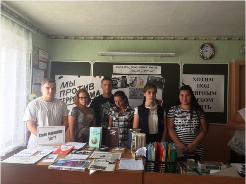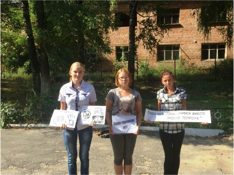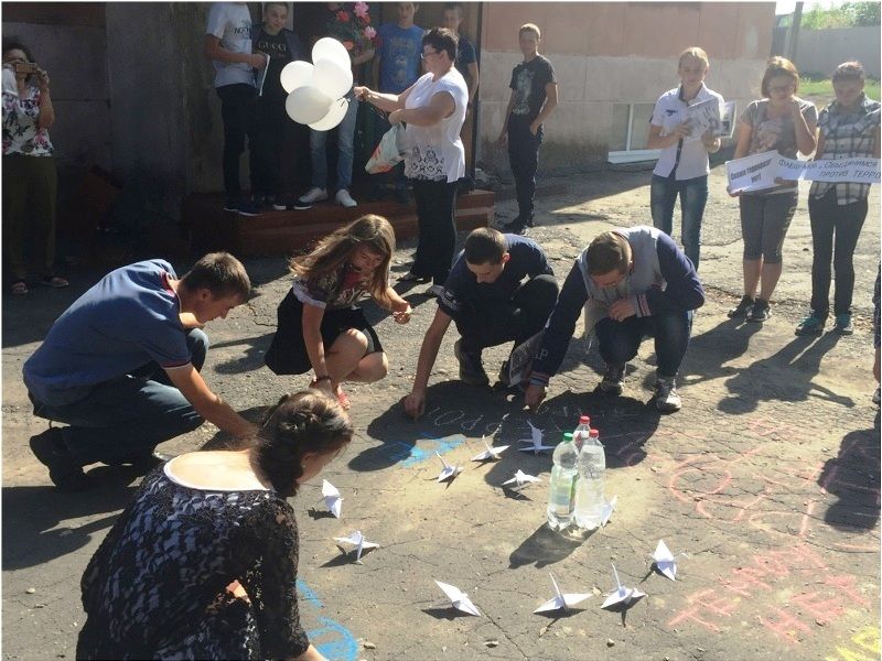 В ходе акции студенты познакомились с хронологией трагических событий в Беслане, ребятами были нарисованы плакаты с лозунгами против терроризма: «Так быть не должно», «Мы против террора». Чтобы почтить память погибших в этой страшной трагедии, участники мероприятия изготовили бумажных журавликов и подарили их зрителям, как символ доброты, мира и согласия.Был проведен флешмоб: «Объединимся вместе против террора!» , где студенты на асфальте сделали надпись «Террору – нет!» «Миру – да!»,поставили бутылки с водой перед фотографией памятника детям Беслана, положили цветы и выпустили в небо белые гелиевые шары с привязанными черными лентами, как символ чистоты детской души. Минутой молчания собравшиеся почтили память жертв терроризма. Закончили акцию подписями на плакате «Мы против террора!». Студенты внимательно знакомились с материалами книжной выставки «Скажи терроризму нет!» и получили буклет «Мир без насилия».