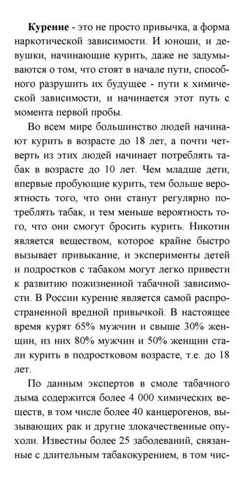 Курение - это не просто привычка, а форма наркотической зависимости. И юноши, и девушки, начинающие курить, даже не задумываются о том, что стоят в начале пути, способного разрушить их будущее - пути к химической зависимости, и начинается этот путь с момента первой пробы.