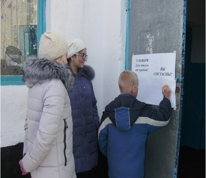 На выставке была размещена литература о вреде курения и две баночки с надписями «Брось сигарету» и «Возьми конфету». При входе в библиотеку размещался плакат «15 ноября – День отказа от курения! Вы согласны?», на котором все пришедшие в этот день в библиотеку, в знак согласия могли поставить свою подпись.