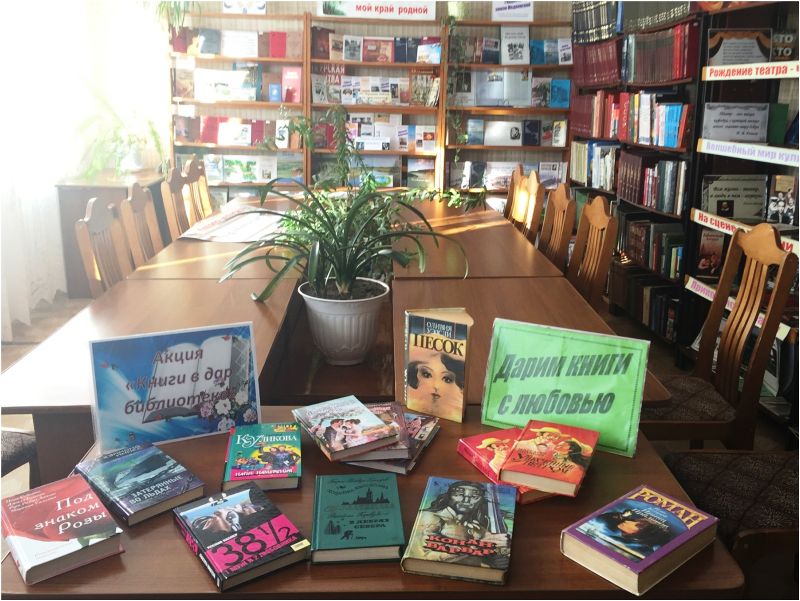 Наши читатели охотно откликнулись на эту акцию и приносили в дар книги из своих домашних фондов. Это была и классика и детективы. Особенно хочется поблагодарить за подаренные книги: Ткачёву Н.М., Севрюкову Л.А., Козявкину Л.А. и других. Библиотека принимала в дар книги целую неделю. И как итог, была оформлена книжная выставка «Дарите книги с любовью».