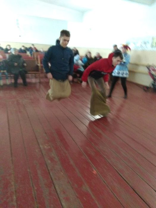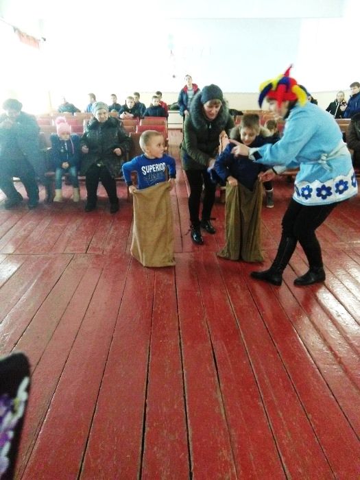 Гуляние открыли скоморохи. Звучали песни, проводились разнообразные игры «Перетягивание каната», «Бой подушками», «Бег в мешках», «Надувание шариков», «Силачи». Все участники игр были награждены сладкими призами.