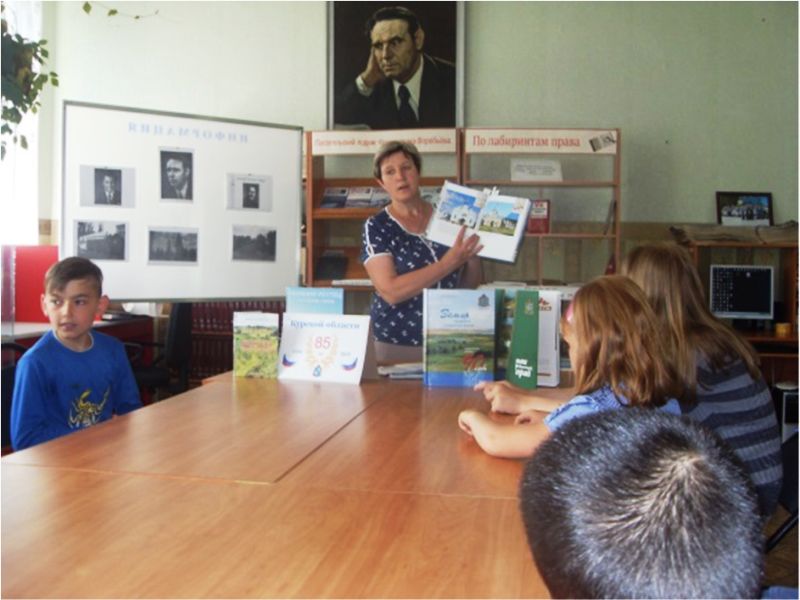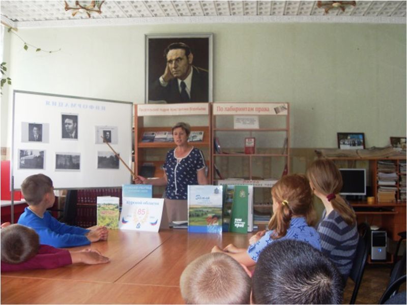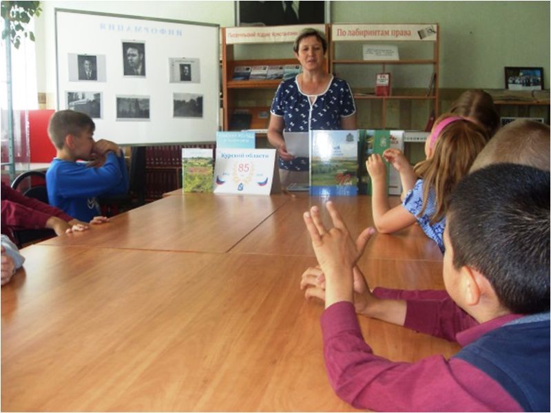 Заведующая библиотекой рассказала о достопримечательностях Курской области, о наших знаменитых земляках. Была представлена презентация о курском крае и о писателе-земляке К.Д.Воробьеве. Дети отвечали на вопросы викторины. Учащихся познакомили с книжной выставкой «Курской области - 85 лет».