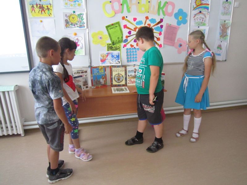 Вниманию ребят была представлена книжная выставка «День России». Ребят из первого и второго отряда познакомили с историей праздника, а затем была показана презентация о Курском крае, его истории и знаменитых людях. Для ребят третьего и четвертого отрядов был показан видеоролик « История России». В исполнении девочек прозвучали песни «Россия, мы дети твои», «Девочка Россия».