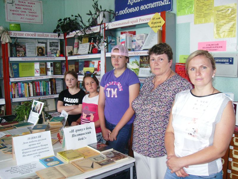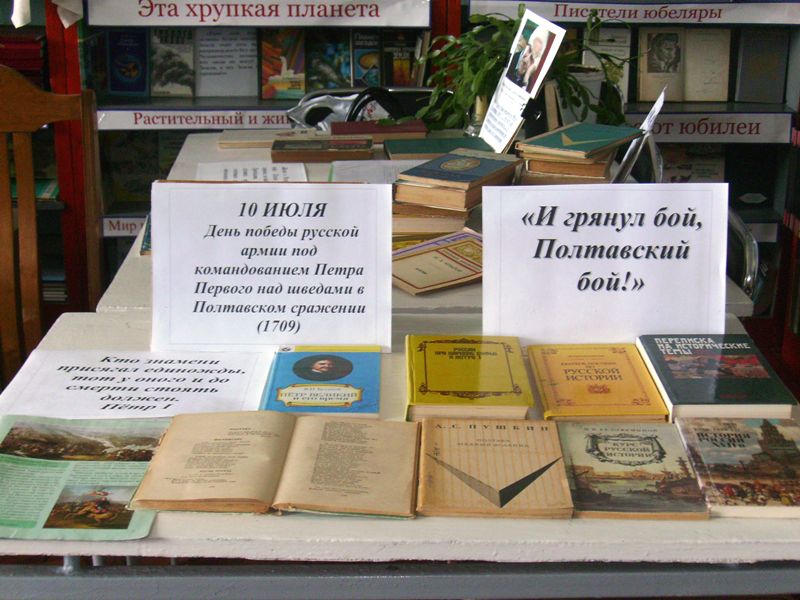 Вниманию юных читателей была представлена книжная выставка-гордость «И грянул бой, Полтавский бой!», на которой демонстрировались лучшие образцы литературных произведений и произведений искусства, повествующих об истории полтавского сражения.