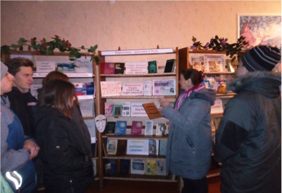 В ходе мероприятия говорили о последствиях, связанных с приёмом наркотических средств, просмотрели видеоролик «Всё о вреде снюса». В библиотеке молодёжь познакомилась с книжной выставкой «Наркотики - трагедия и боль», у выставки провели обзор.