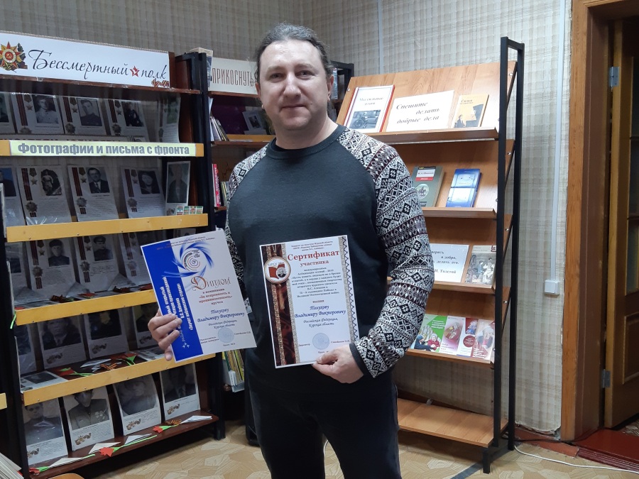 Дипломом в номинации «За искренность и проникновенность» награждён Полухов В.В. за участие в Международном открытом онлайн конкурсе чтецов произведений В.С.Алёхина «Звучат Алёхинские строки», а также Сертификатом участника Международных Алёхинских чтений 2019, посвященных творчеству незрячего курского писателя В.С. Алехина. Для присутствующих была организована книжная выставка «Спешите делать добрые дела» . Медвенская детская школа искусств подготовила концертную программу.