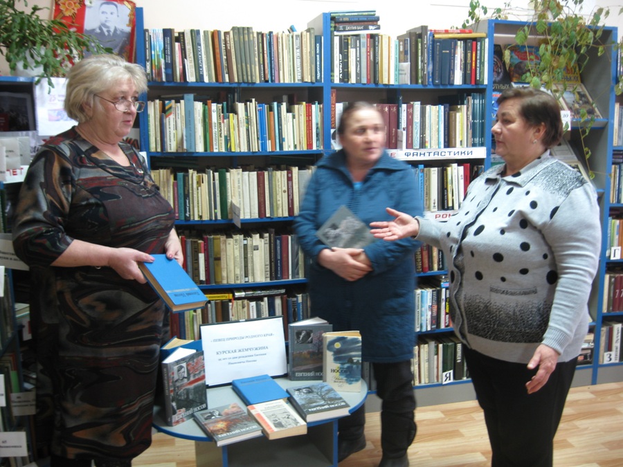 Из рассказа библиотекаря присутствующие узнали об интересных фактах из жизни выдающегося писателя Курского края Е.Носова, а также были представлены видеоматериалы. На книжной выставке «Певец родного края» представлены книги, отражающие многогранную жизнь и творчество писателя.