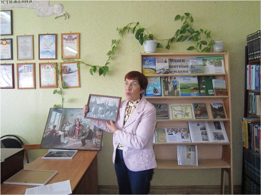 Директор музея им. Е. М. Чепцова Л. А. Атнюкова рассказала о военном периоде творчества Ефима Михайловича. В годы войны наш талантливый земляк сражался с фашистами кистью. На память о встрече Лидия Алексеевна подарила участникам встречи буклеты.