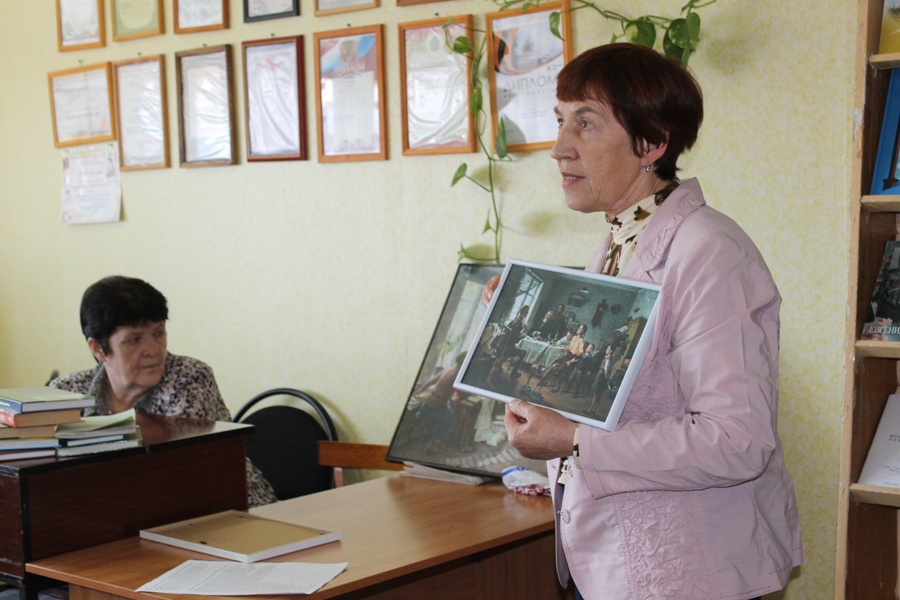 Директор музея им. Е. М. Чепцова Л. А. Атнюкова рассказала о военном периоде творчества Ефима Михайловича. В годы войны наш талантливый земляк сражался с фашистами кистью. На память о встрече Лидия Алексеевна подарила участникам встречи буклеты.