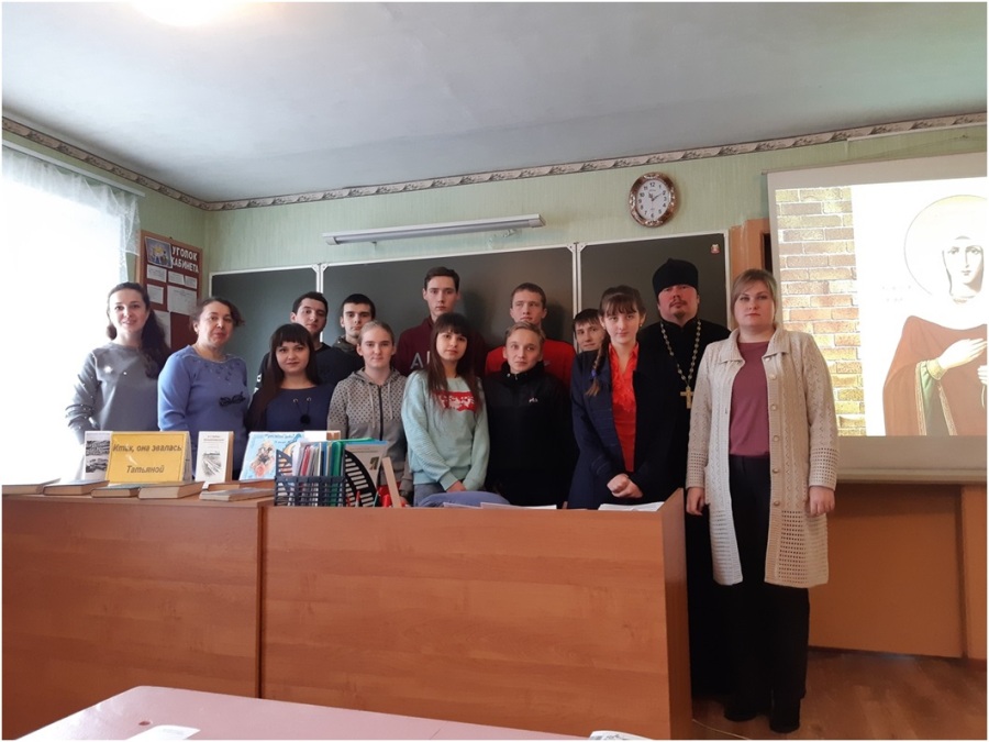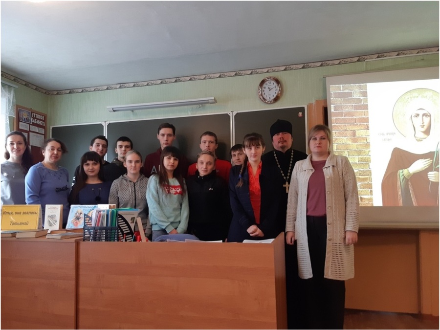 24 января, накануне дня памяти святой мученицы Татьяны и Дня российского студенчества, в Медвенском филиале ОБОУСПО «Обоянский аграрный техникум» сотрудники МКУК«Межпоселенческая библиотека Медвенского района» совместно с постоянным представителем Центра духовно-нравственного воспитания администрации Медвенского района священником Димитрием Долженковым провели час лирики «Татьяна милая душою».