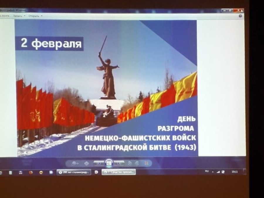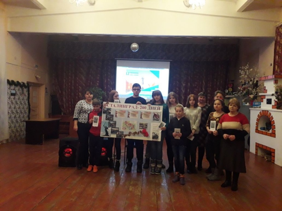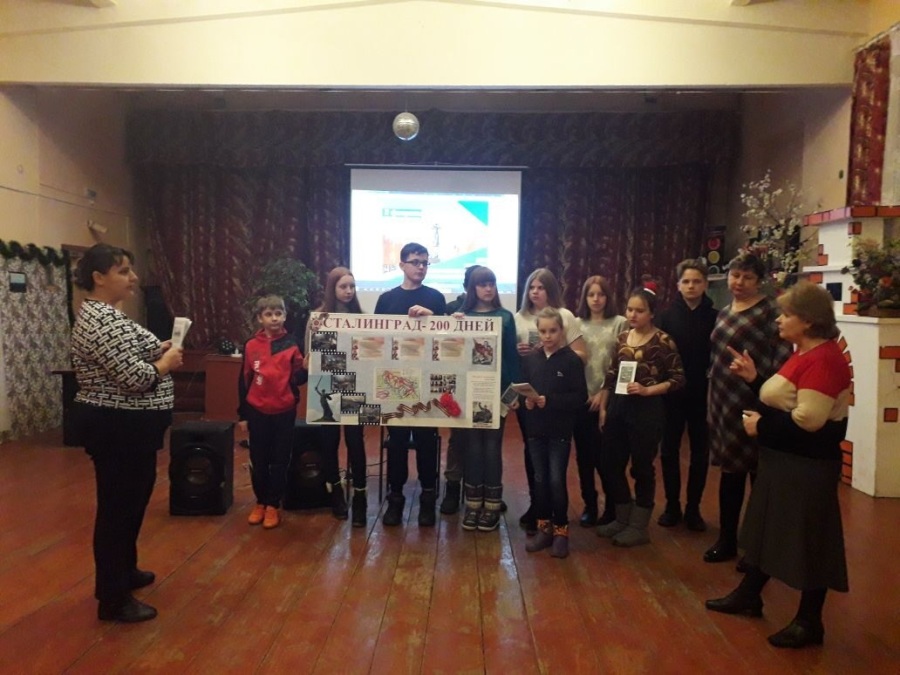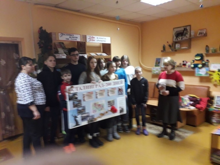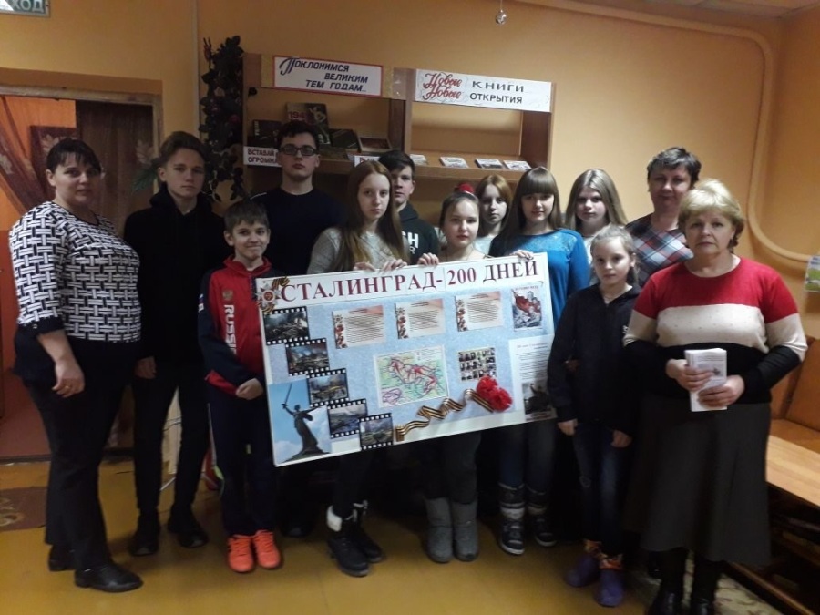 Вступительная часть была посвящена историческим фактам Сталинградского сражения, затем библиотекарь познакомила ребят с литературой об этом периоде истории, был подготовлен информационный стенд «Сталинград -200 дней». В ходе мероприятия работники культуры подвели итог, что 200 дней ожесточенных боев на Волге, переломили ход войны в пользу Советского Союза.