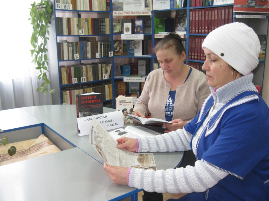 В библиотеке была представлена книжная выставка « Афганистан наша память и боль». Посетители узнали много об Афганской войне и последствиях этой войны. Долг нашего поколения с уважением относится к ветеранам Афганистана, ведь они сражались за интересы своей Родины, выполняя свой солдатский долг, не жалея жизни.