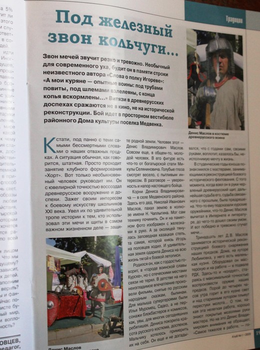 Она об увлечённом, богато одарённом человеке – руководителе клубного формирования «Хорт» Медвенского РДК Денисе Владимировиче Маслове. Этот очерк о том, как человек находит своё призвание, как помогает найти свою дорогу в жизни детям. А ещё он – о любви к Родине, к седой старине и дню сегодняшнему.