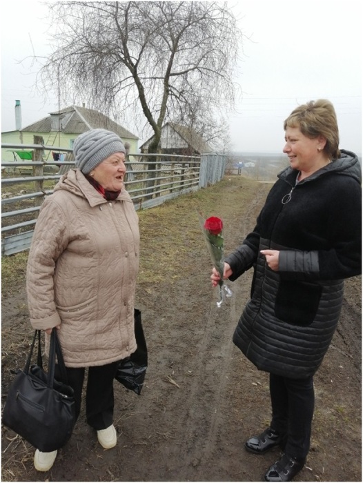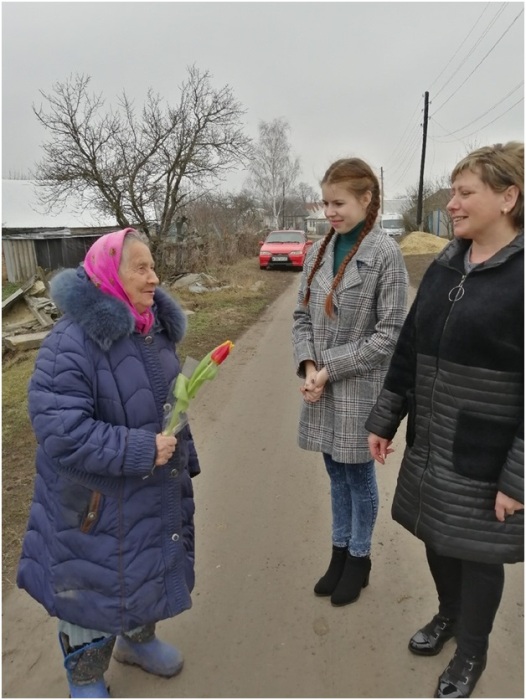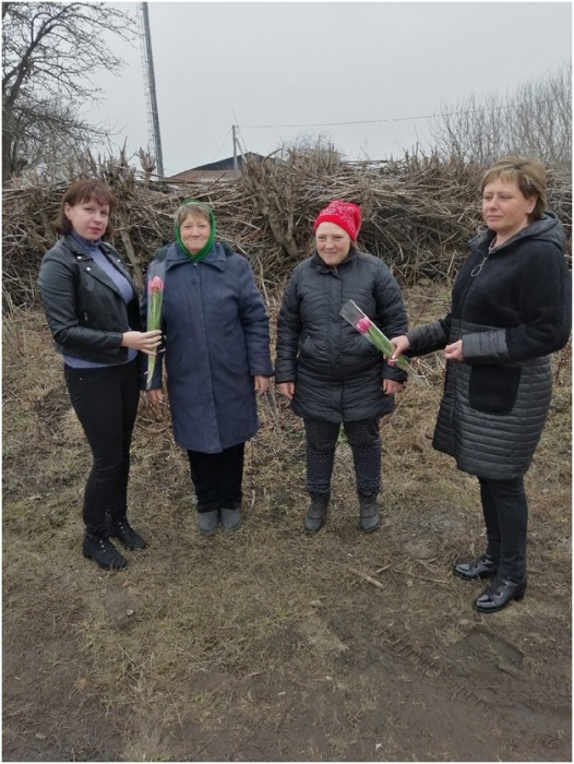 Библиотекарь и волонтеры поздравляли женщин с. Паники и вручали им цветы. Женщинам было очень приятно и радостно.