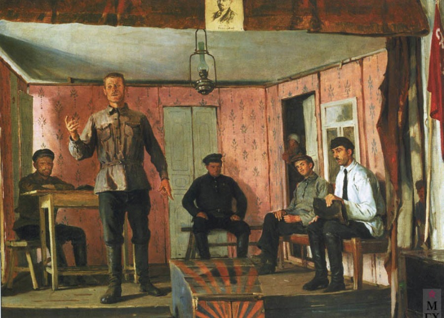 Есть такая известная серия «ЖЗЛ», а нашему району можно выпустить «ЖЗМ» – «Жизнь замечательных медвенцев». Один из них станет героем нашей сегодняшней виртуальной экскурсии в музее им. Д. Я. Самоквасова. Это Георгий Акимович Сухомлинов – первый секретарь волостной комсомольской ячейки в Медвенке. Он изображён на картине Е. М. Чепцова «Заседание сельской ячейки».