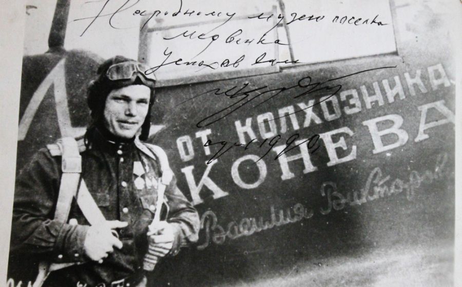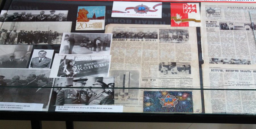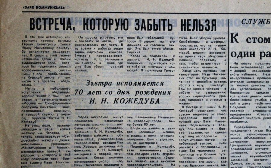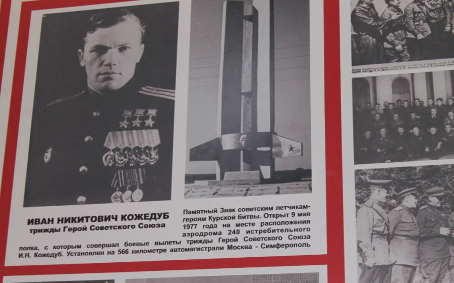 К славной дате в музее им. Д. Я. Самоквасова открылась выставка. На ней – военная фотография Кожедуба с его дарственной надписью медвенскому «хранилищу памяти», снимки с открытия памятника, районные газеты. Уважаемые земляки! Вы видите часть экспозиции, полностью вы сможете увидеть её, когда закончится самоизоляция, посетив музей.