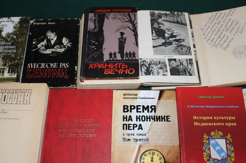 Председатель общества, заведующая музеем им. Д. Я. Самоквасова О. В. Артёмова продемонстрировала собравшимся книги, ставшие экспонатами. Это богатый художественный, мемуарный материал о Великой Отечественной войне. Есть в этих книгах строки и о курянах, и о медвенцах.