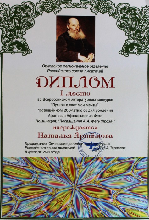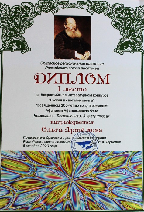 Члены Союза писателей РФ Ольга и Наталья Артёмовы стали победителями Всероссийского литературного конкурса «Пуская в свет мои мечты» в номинации «Посвящения А. А. Фету. Проза».