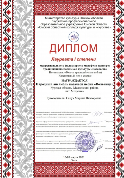 Новая победа!!! Дипломом лауреата 1 степени межрегионального марафона-конкурса традиционной славянской культуры "Радовесть" удостоен народный ансамбль казачьей песни "Вольница"!