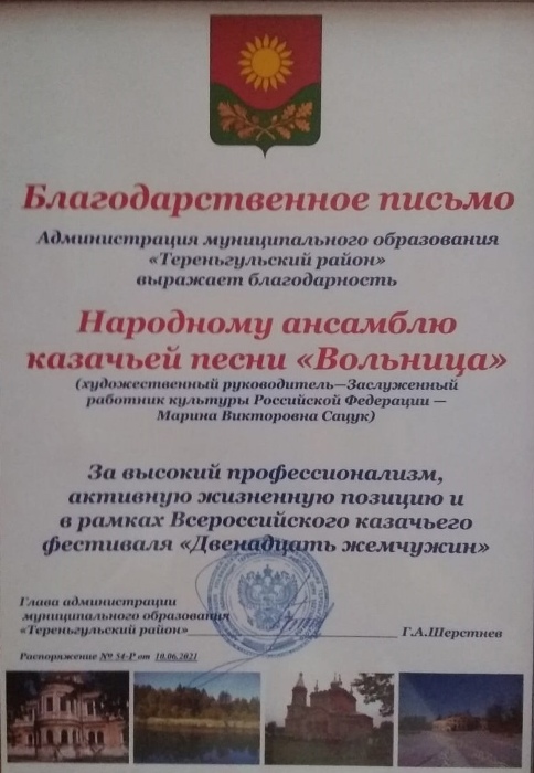 Исполнение произведения "Что за песни распевают" отметила министр искусства и культурной политики Ульяновской области Е.Е. Сидорова и лично поблагодарила начальника управления культуры Медвенского района Ю.И. Черняк за её талант и необыкновенный голос!