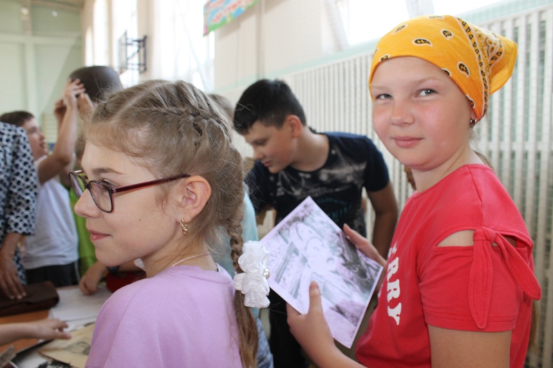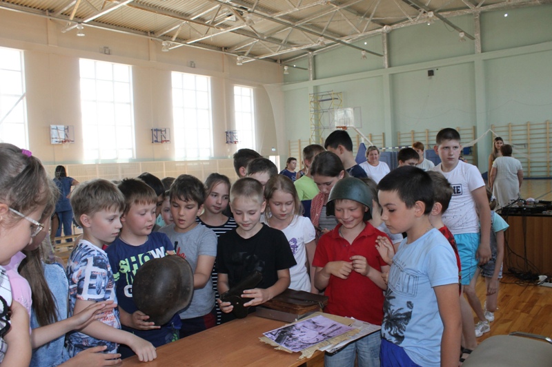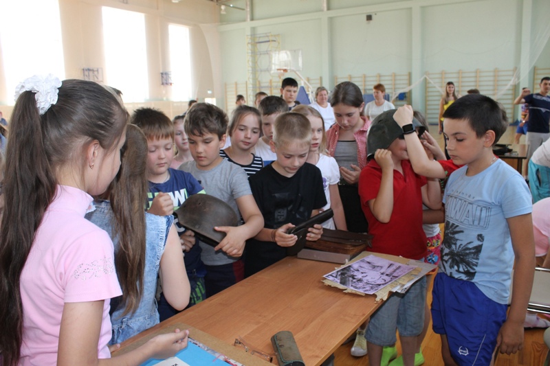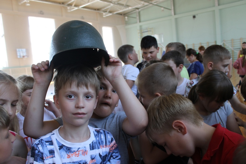 Бурю восторга вызвала у мальчишек и девчонок возможность примерить каску красноармейца, прикоснуться к предметам «сороковых, роковых».