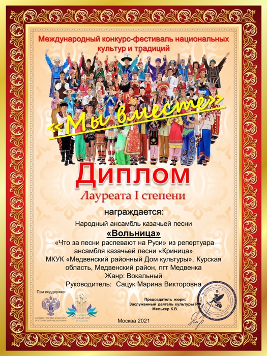За триумфальными победами народного ансамбля казачьей песни "Вольница" стоит кропотливый, но благодарный труд руководителя коллектива - заслуженного работника культуры Российской Федерации Марины Викторовны Сацук.