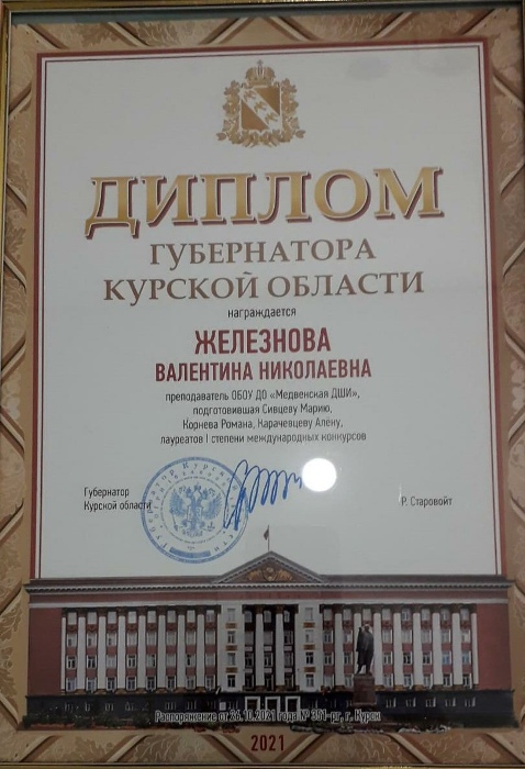 Слова благодарности прозвучали и в адрес наставников-педагогов! Валентина Николаевна Железнова, руководитель детского ансамбля "Вольница - Kids", из рук Губернатора получила свой заслуженный Диплом.