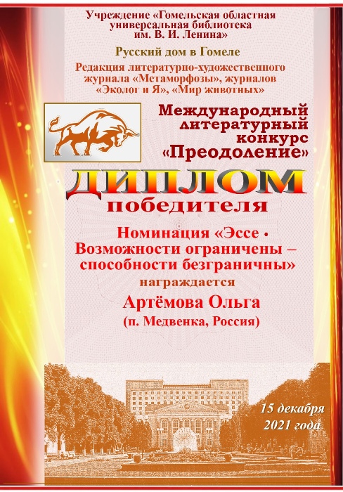Член Союза писателей России Ольга Артёмова стала победителем Международного литературного конкурса «Преодоление» (г. Гомель, Беларусь).