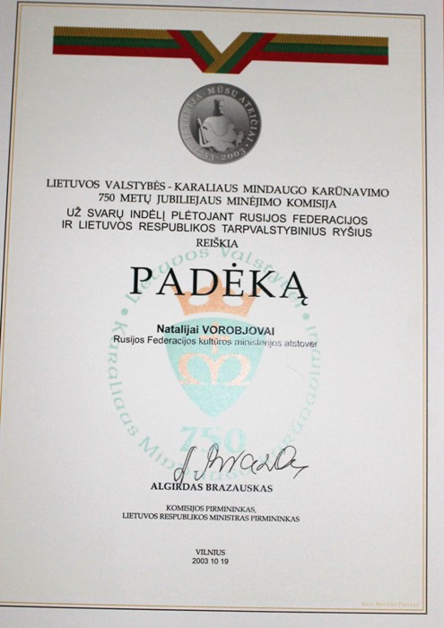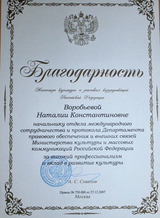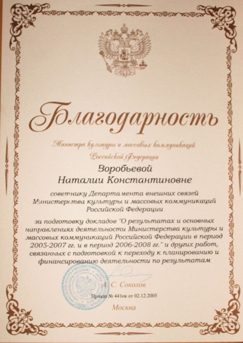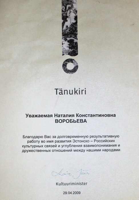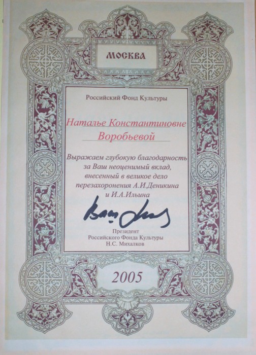 Она и сама всю жизнь среди тех, кто сеет «разумное, доброе, вечное». В Министерстве культуры России на её плечи ложилось выполнение поручений Президента, Правительства, сопровождение министров во время их визитов в страны Балтии. Она работала с соотечественниками за рубежом, организовывала сотрудничество с театрами, музеями, галереями, творческими союзами. Два года участвовала в Правительственной Комиссии на переговорах России и Эстонии. В её рамках была создана группа по российско-эстонскому культурному сотрудничеству, выпущен совместный Каталог по перемещенным культурным ценностям. И апогей деятельности – участие в перезахоронении праха генерала Антона Деникина (из Франции) и русского философа Ивана Ильина (из Швейцарии) в Москве на кладбище Свято-Донского монастыря. В 2021 году Н.К. Воробьёва возглавила открытый литературный конкурс К.Д. Воробьёва «…И всему роду твоему», который проводил Медвенский район.