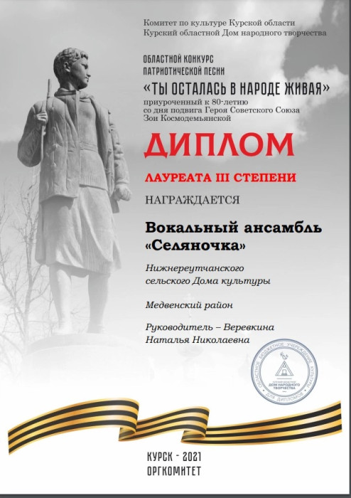 На базе Курского Дома народного творчества прошел областной конкурс патриотической песни «Ты осталась в народе живая…» , приуроченный к 80-летию со дня подвига Героя Советского Союза Зои Космодемьянской.