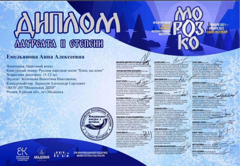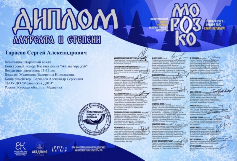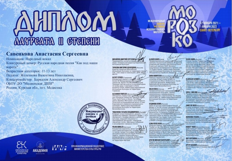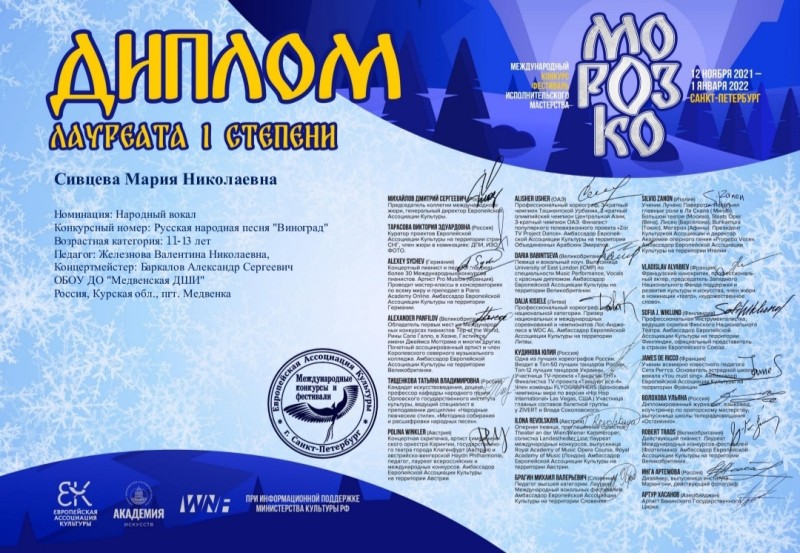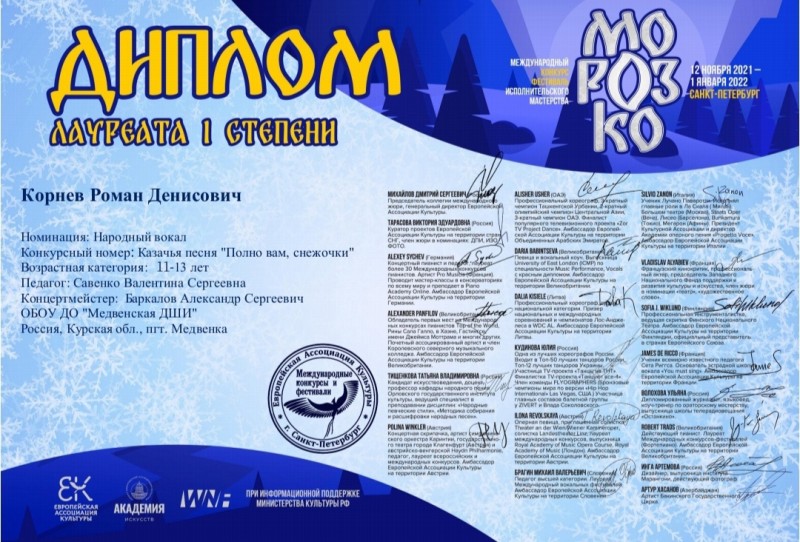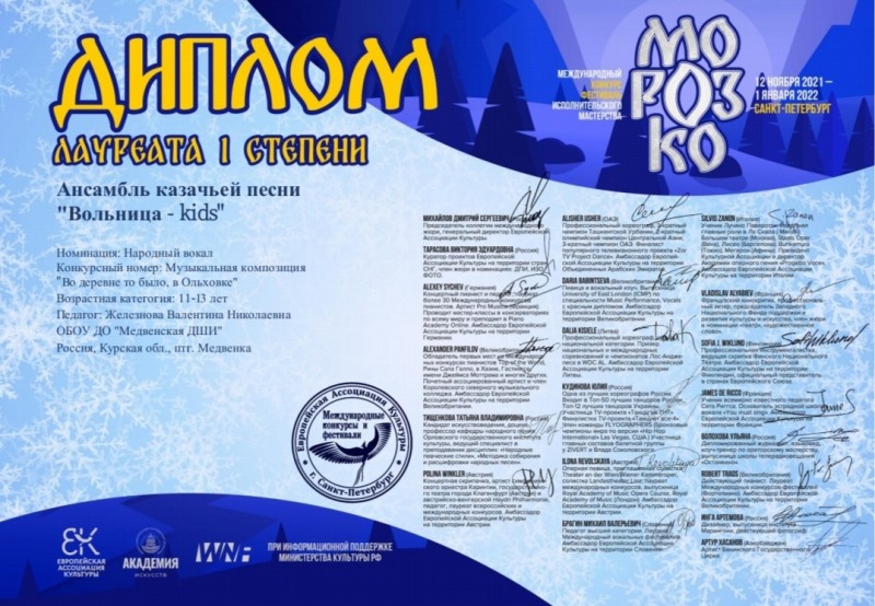 В этот прекрасный день, спешим поздравить коллектив детского ансамбля казачьей песни «Вольница-kids» и его преподавателя - Валентину Николаевну Железнову с победами в Международном конкурсе-фестивале «МОРОЗКО», прошедшего в г. Санкт-Петербург.