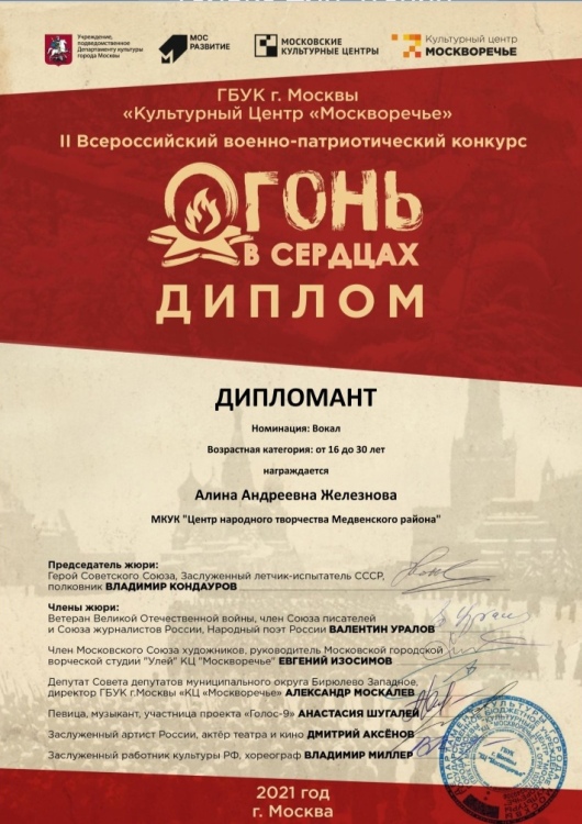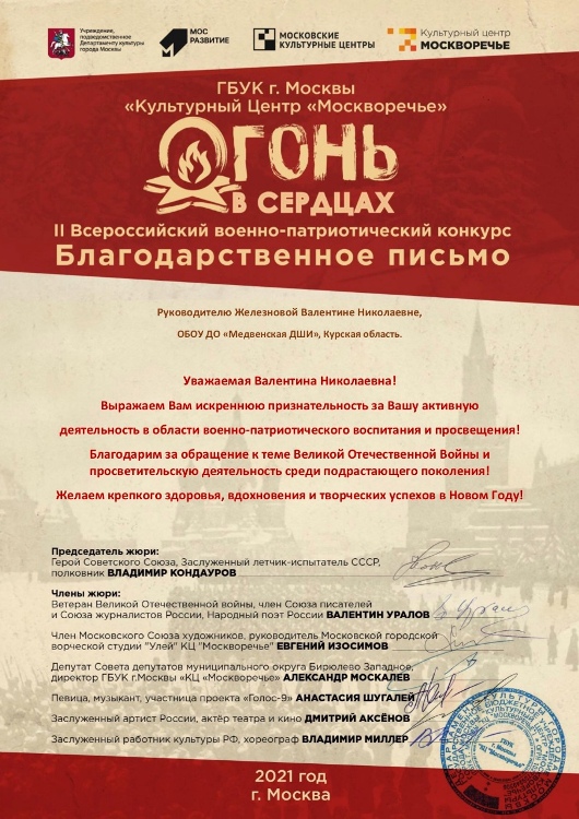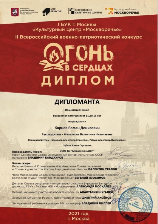 Благодарственными письмами оргкомитета конкурса отмечены руководитель Валентина Николаевна Железнова и концертмейстеры Александр Николаевич Рябуха и Антон Сергеевич Зубков.