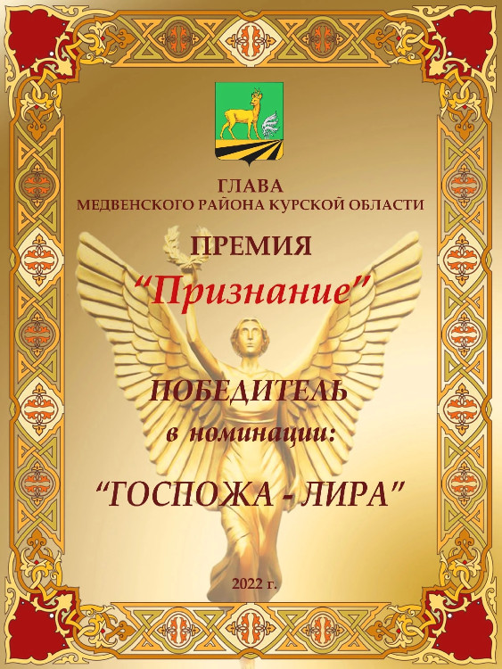В номинации «Госпожа Лира» победителем премии Главы Медвенского района признана Лихачева Елена Ивановна, хормейстер Народного хора Центра народного творчества Медвенского района.